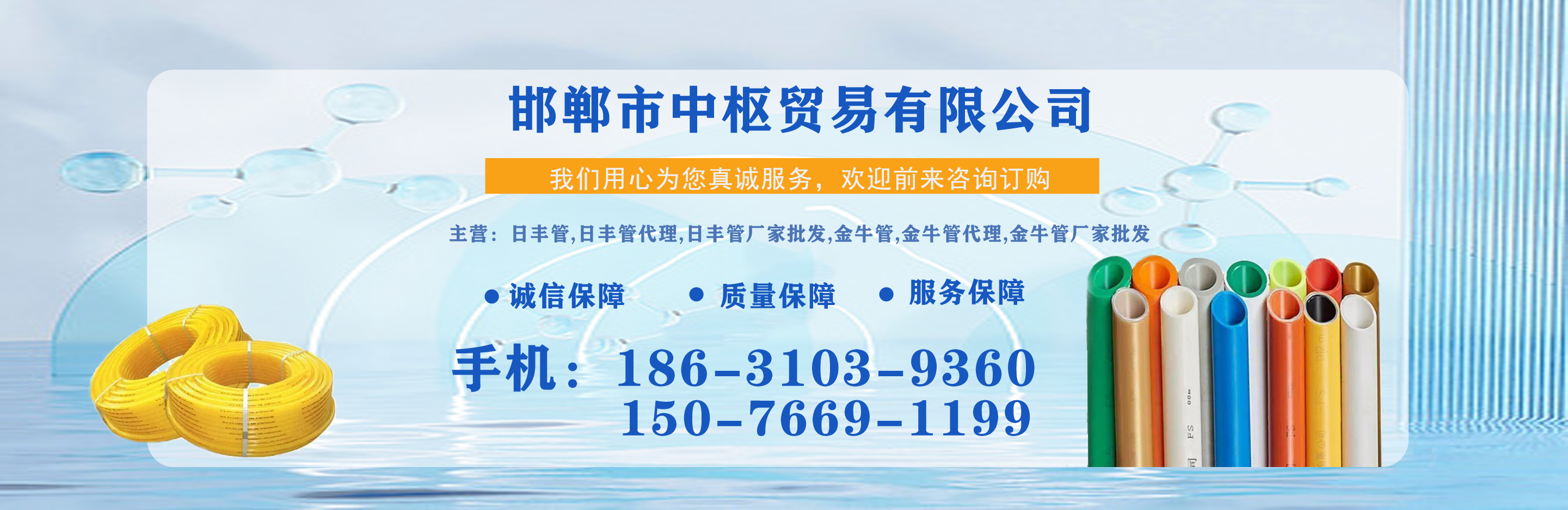 邯鄲市中樞貿易有限公司主營日豐管,日豐管代理,日豐管廠家批發,金牛管,金牛管代理,金牛管廠家批發等,質量可靠,值得信賴!  我公司在產品行業積累了豐富的經驗,具有嚴格的管理制度,同時引進先進的生產設備和生產技術,一如既往的為廣大客戶提供質優價廉的產品。創辦多年來在市場上贏得較好的口碑,銷售網絡覆蓋全國各個省市及地區?! ≠|量為先,信譽為重,管理為本,服務為誠,我們將致力于這一經營理念,關注時代發展,用先進的技術,不斷創新求實,以更優的質量,更好的服務來滿足我們的廣大客戶。  公司理念:勇于進取、開拓創...